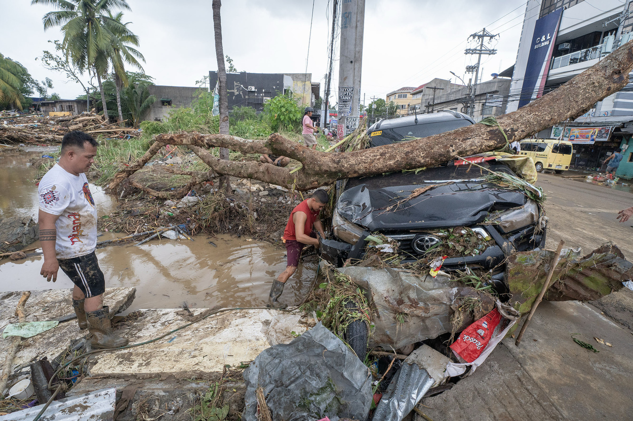 A man struggles to connect a hose to a broken pipe hidden under the SUV damaged by a fallen tree. MindaNews photo by BOBBY TIMONERA