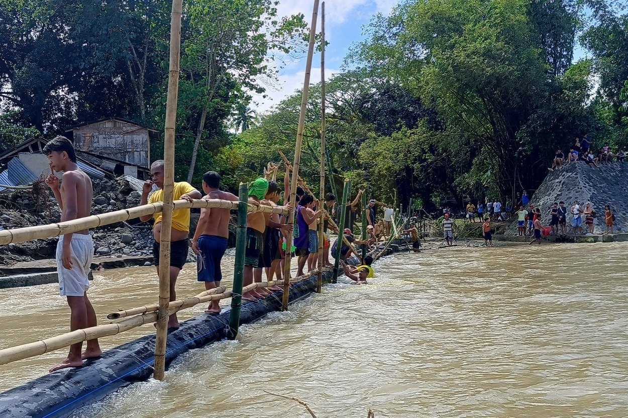 (Residents of Malindawag practice bayanihan, installing bamboo poles to stabilize a makeshift crossing after floodwaters damaged infrastructure.